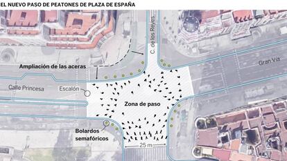 La intersección entre Gran Vía y plaza de España tendrá un paso de peatones transversal que permitirá cruzar la calzada en todas direcciones, incluso en diagonal, al estilo del que puede verse en el barrio de Shibuya (Tokio). El nuevo paso de peatones, tal y como adelantó EL PAÍS, no tendrá semáforos para los viandantes, sino bolardos semafóricos, un tipo de elementos urbanos de algo más de un metro de alto coronados por una luz que cambia del rojo al ámbar y de ahí al verde. Cuando los 16 bolardos se pongan en verde, los caminantes podrán cruzar en todas las direcciones. Hasta ahora, había que esperar al menos dos semáforos para llegar a la esquina contraria.