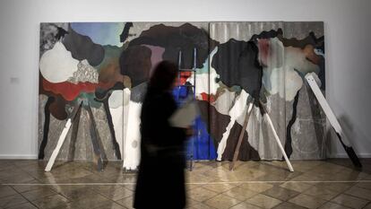 La muestra prosigue por sus ámbitos más íntimos, con obras como Signes acumulats (1997) y Pasarela Bagdad (1997) en la que creó exvotos laicos, unas estructuras de rígido plástico que quemó y parecen pieles. O su fructuosa carrera internacional, tras sus viajes y estancias en Nueva York, donde “lo pasó muy mal”, explica su hija; un ámbito que recoge su participación en las bienales de arte más importantes del mundo y donde recibió premios internacionales. Aquí destacan las impresionantes obras Metrop y Nova York, las dos de 1988, en las que no faltan referencias, incluso al poeta Federico García Lorca, al que admiraba.