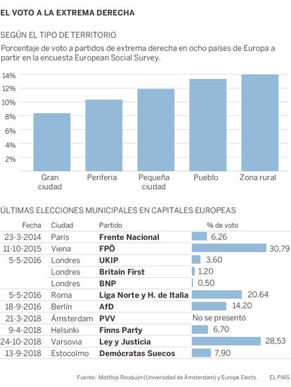 Estudios a nivel europeo han mostrado esa debilidad de los partidos populistas en las grandes ciudades. Un análisis del sociólogo de la Universidad de Ámsterdam, Matthijs Rooduijn, compartido con este periódico muestra que el voto a la derecha radical en ocho países europeos cae conforme nos alejamos de la gran ciudad hacia su exterior y alcanza seis puntos más en el entorno rural. Hay dos asuntos principales que están alimentando este fenómeno en estas zonas, según Rooduijn: el rechazo a la inmigración y la insatisfacción con la democracia.