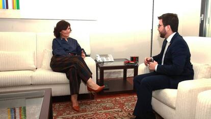 La vicepresidenta defendió con rotundidad la posición expresada desde que llegó a La Moncloa hace ocho meses el presidente Pedro Sánchez sobre la necesidad de dialogar para reconducir la crisis catalana frente a la inacción y judicialización a la que se entregó el Ejecutivo de Mariano Rajoy. La mesa de partidos a la que se refirió la vicepresidenta es la que está en marcha ya en Cataluña, que en la tarde de este martes tenía prevista otra cita, y a la que no acuden ni Ciudadanos ni PP.