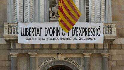 El 'president' ha quitado los lazos dos horas y media antes de que se cumpliera el plazo dado por la Junta Electoral y coloca una nueva pancarta en la que pide libertad de expresión