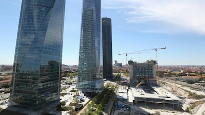 Un grupo operarios remata la escalera que llevará al futuro piso 16. Y, enseguida, uno de ellos coloca una banda roja que impide el paso. “Hasta que no esté levantada la planta no se podrá subir”, advierte. Un empleado de la cercana Torre de Cristal se asoma para contemplar las obras. En un año y medio, las cuatro torres serán cinco.