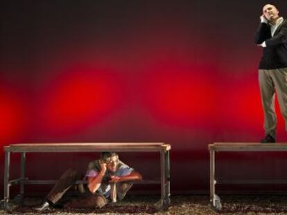 Lorca y Merino, en una escenografía casi minimalista (un fondo ocre y unas alfombras sobre las tablas que esconden los elementos que utilizarán los actores, que no abandonan el escenario en ningún momento) despliegan un juego de precisión, desdoblándose en multitud personajes separados por 500 años de historia. Los vecinos del pueblo reunidos en asamblea; mujeres respirando mercurio para exigir una indemnización ("tenemos que mantener los síntomas para negociar"); dos lugareños sin más distracción que leer el horóscopo en un diario viejo; el recepcionista clarividente y repelente de un hotel que se presume cochambroso o el empresario humanizado al llamar por teléfono a su familia (misión complicada: las líneas, ya se sabe, la cobertura...). Un cambio mínimo en el vestuario, en el gesto o incluso en la mirada, basta para cambiar de universo. En ello Titzina son expertos.