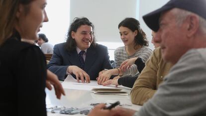 Lo que no podía imaginar este madrileño de 27 años es que ayudaría a un arquitecto a diseñar un edificio y a eso se ha dedicado algunas tardes de este segundo cuatrimestre con alumnos de cuarto curso de Arquitectura de la Universidad CEU San Pablo. 15 estudiantes de nueve países (es la modalidad bilingüe del grado), acompañados por voluntarios de la ONCE durante su asignatura Composición Arquitectónica, han de realizar el proyecto de una escuela, sin olvidar que esto forma parte de su carrera y que el 7 de mayo presentan los proyectos por los que serán evaluados. Pablo Campos, el profesor que ideó esta manera trabajar, deja claro que no son una ONG: “Es un ejercicio académico”. Pero hace hincapié en que pretende inculcar que la arquitectura hay que mirarla desde multitud de puntos de vista, incluso desde el de a quien le falta, precisamente, ese sentido. Hay que percibirla. Uno de los objetivos de la arquitectura es facilitar la vida de las personas, sin distinción. Campos incide en que va más allá de la accesibilidad, que está reglada y solo hay que conocer la ley y cumplirla. Recalca el sentimiento, para apelar a esto en una de sus clases puso un vídeo corto en el que Zubin Mehta dirigía la Filarmónica de Berlín interpretando un fragmento de la Sinfonía nº 3 de Camille Saint-Saëns. Cuando acabó dijo: “Dos escalas, dos intensidades”.
