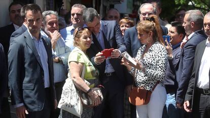 Sánchez se ha detenido a cada momento a hacerse fotos con quien se lo solicitaba. Exhibía esa sonrisa como de anuncio de dentífrico, que sobresale por entre todas las cabezas dada la altura del presidente. “Estos son los candidatos para Madrid”, le explicaba a una señora que le pedía una foto, señalando a los candidatos socialistas a la Comunidad y el Ayuntamiento, Ángel Gabilondo y Pepu Hernández. Pero a su lado hoy ambos parecían más bien comparsas, los guitarristas de un grupo donde el famoso es el cantante. La sensación se ha acentuado cuando cinco chicas adolescentes se le han acercado y, tras verlo de cerca, han empezado a gritar con ese característico tonillo histérico que más bien suele dedicarse a los ídolos de la canción.