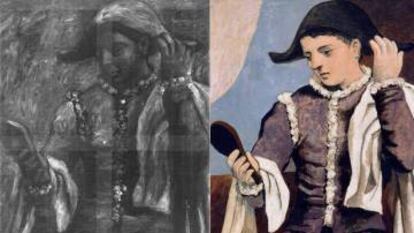 La figura del arlequín es un alter ego de Picasso como demuestra el gran número de veces que lo representa. En una ocasión incluso se retrató como uno de ellos. Es el caso de Arlequín con espejo,de 1923 y en el Thyssen de Madrid. El cuadro iba a ser un autorretrato (como demostró los rayos X), pero al final vistió a la figura de saltimbanqui y el rostro-máscara de pierrot, que camufla su identidad del artista. Incluso se dibujó en origen con las piernas abiertas y acabó con ellas cerradas.