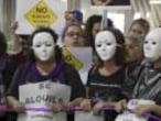 La pareja sale de la agencia en San Sebastián de los Reyes y se encuentran un cartel en una parada de autobús que dice: “Denuncia la utilización del cuerpo de las mujeres, sin acoso sexual y sin alquiler de vientres”.