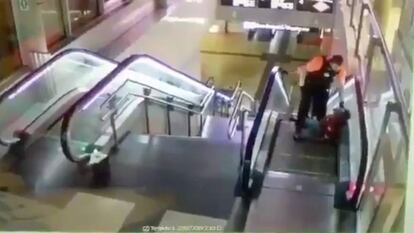 Según se ve en las imágenes, ambos vigilantes esperan a que el hombre se levante, no sin cierta dificultad, por sus propios medios. Después, uno de ellos lo agarra por el cuello y lo arrastra por las escaleras mecánicas.