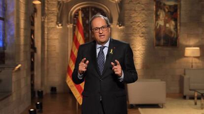 La unidad de acción de los partidos independentistas pasa por sus horas más bajas justo antes de la celebración, este miércoles, del Onze de Setembre. Las formaciones políticas, sin embargo, han intentado aparcar sus reproches mutuos en las últimas horas para no desmotivar la participación en la gran concentración que promueven la Assemblea Nacional Catalana (ANC) y Òmnium. El líder catalán, Quim Torra, aprovechó este martes su mensaje institucional para insistir en “el derecho a decidir” como única posibilidad para resolver el conflicto político. “Si aún no somos libres es porque aún no hemos acabado el camino”, ha asegurado el president.