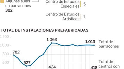 Centros en barracones: Este curso 418 centros trabajan en barracones; por los 424 de 2009-2010 y los 404 de 2014-2015.