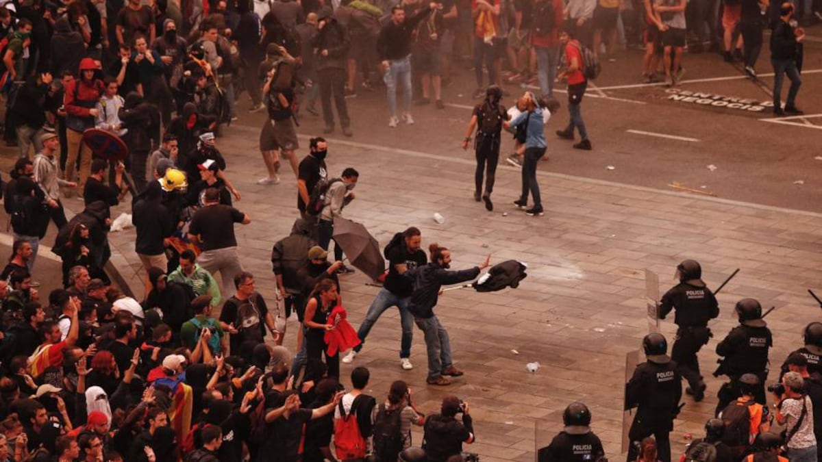 En el lugar, el cordón policial fue replegándose poco a poco, hasta retirarse cuando la gran concentración se encontraba ya en la plaza central del aeropuerto, que a partir de las cinco de la tarde se convirtió en el principal objetivo de antidisturbios, que fueron apartando a la gente en diferentes tandas. Pese a la llamada a la no violencia, algunos manifestantes lanzaron algunos objetos a los policías. Otros intentaban zafarse del desalojo policial sentándose en el suelo, bajo una ligera lluvia que empezó a arreciar por la tarde. En los últimos meses, el independentismo se ha referido reiteradamente a las protestas de Hong Kong, donde miles de personas han tratado de colapsar también las instalaciones aeroportuarias.
