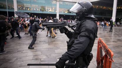 Tanto Mossos como Policía Nacional cargaron con contundencia en el aeropuerto para despejar la zona. Los antidisturbios de la policía catalana usaron los proyectiles de viscoelástica, un tipo de munición de precisión, que no rebota, y la Policía Nacional lanzó pelotas de goma, que se lanzan contra el suelo y tienen luego una trayectoria errática. El Parlament prohibió las pelotas de goma como dotación de los Mossos por su alta capacidad lesiva. Este tipo de arma sí forma parte de la dotación de la Policía Nacional y la Guardia Civil, que consideran que pueden utilizarla en toda España.