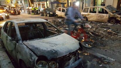 - COCHES QUEMADOS. El balance provisional también apunta a una docena de vehículos calcinados en la calle de Roger de Flor. También resultaron quemadas varias motos, por proximidad a los coches.