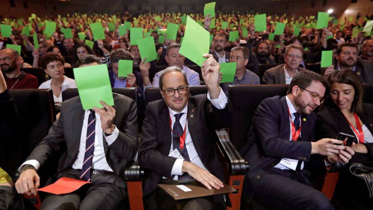 Miquel Pueyo, alcalde de Lleida, de ERC, condujo inicialmente el cónclave, que fue organizado por un grupo de dirigentes, entre los que figuran Elsa Artadi, concejal de Barcelona; la alcaldesa de Girona, Marta Madrenas, o Dolors Sabater, edil y exalcaldesa de Badalona. Con unas cartulinas verdes exhibidas a mano alzada, los asistentes aprobaron por unanimidad la constitución de la asamblea, el nombramiento de un grupo promotor y el posicionamiento político del órgano. Fue un documento de mínimos, con el rechazo a la sentencia, la amnistía para los presos y el regreso de los “exiliados”, la movilización popular, el diálogo con el Estado sin renunciar a la mediación internacional y a trabajar por la autodeterminación.