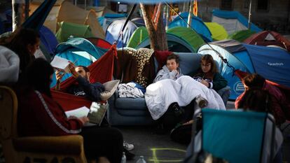 La unidad en la acampada, iniciada el pasado 30 de octubre en la plaza Universidad de Barcelona contra la sentencia del Tribunal Supremo sobre los líderes del procés , se ha partido este viernes en dos después de que varios jóvenes que participan en la protesta anunciaran —en la asamblea diaria— que la mejor táctica era abandonar la plaza antes de las elecciones de este domingo. La propuesta, proveniente de sectores juveniles de ERC y la CUP, sentó como un jarro de agua fría entre los participantes en la protesta de ideología anarquista. Tras horas de un encendido debate entre los colectivos, varias decenas de acampados, los relacionados con partidos políticos, abandonaron la plaza mientras que el resto continúa en ella. Los campistas que permanecen en la explanada han acusado a los que levantaron el campamento de haberse llevado la caja de resistencia.