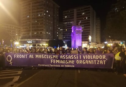La marcha, encabezada por una pancarta con el lema Front al masclisme assassí i violador, feminisme organitzat [Frente al machismo asesino y violador, feminismo organizado]', ha arrancado alrededor de las 19.30 horas en la Porta de la Mar, iluminada de violeta, y ha recorrido las calles Colón, Xàtiva y Marqués de Sotelo para finalizar en la plaza del Ayuntamiento, donde con máscaras en el suelo se ha recordado a las decenas de mujeres asesinadas por sus parejas o exparejas.