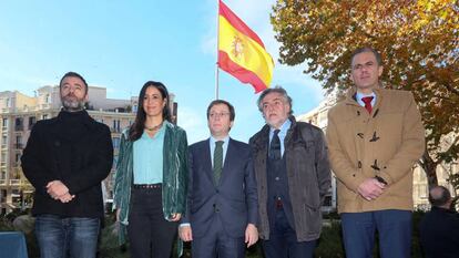 El Ayuntamiento repartió copias de la constitución entre los asistentes. Luis García Moreno, un jubilado de 66 años en chándal y zapatillas deportivas, guardó la suya como oro en paño. Le llamó la atención que los niños de un colegio cercano que habían sido invitados al acto corearan con entusiasmo a Almeida. "Estos niños gritan "alcalde, alcalde". No te digo lo que dicen en Cataluña...", dijo con misterio. Todos los años, según él, peregrina a la tumba de Adolfo Suárez en Ávila y se pone de rodillas ante la lápida. "Le digo: Adolfo, reencárnate aunque sea de pasante. Ese hombre supo hacer consenso y mayorías. Se abrazó a Carrillo. Ya no tenemos esas figuras", lamentó.