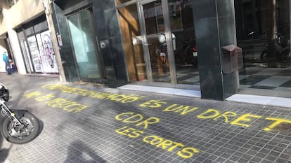 La sede de ERC ha amanecido este martes por la mañana con pintadas de los Comités de Defensa de la República (CDR), coincidiendo con la reunión que mantienen los republicanos y el PSOE para tratar de alcanzar un acuerdo de cara a la investidura de Pedro Sánchez. "La autodeterminación es un derecho, no se negocia", es el mensaje de la pintada realizada en el suelo, justo a la entrada de la sede del partido en la calle Calàbria de Barcelona.