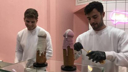 Bauerbaum no tiene constancia de que haya habido más peticiones de sus moldes. Él encargó las herramientas, buscó un local en el barrio madrileño, lo reformó —“una obra pequeña que hemos hecho en dos semanas”— e inauguró el pasado 3 de diciembre. “¿Por qué elegí pollas? Pues… no sé, la verdad”, contesta. “Porque te encantan”, le interrumpe entre risas el único trabajador que tiene contratado en la tienda. A los clientes parece que también les gustan: en poco más de 15 minutos, los dos polleros han servido una decena de gofres.