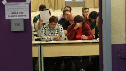 Miembros de varios sindicatos respondían las dudas de los aspirantes. Toñi, de CC OO, enfundada en un peto rojo, enseñaba a una mujer el aula donde tenía que hacer el examen. La clasificación iba por apellidos. La mañana era fría, pero algunos llegan ligeros de ropa y con muchas ganas de pasar el trámite. Es el caso de José Antonio Yagüe, un vecino de 57 años de la localidad madrileña de Alcorcón. Lleva ocho trabajando como repartidor en Correos, siempre como interino. Se ha presentado dos veces, aunque nunca le alcanza para obtener plaza fija. En Madrid, la plantilla del servicio postal cuenta con 10.000 empleados, pero en torno al 25% son trabajadores eventuales. “La temporalidad afecta a muchos empleados. Estas oposiciones buscan que sean fijos y tengan unas condiciones dignas. La estabilidad es buena para todos”, explica Francisco Barrios, de UGT.