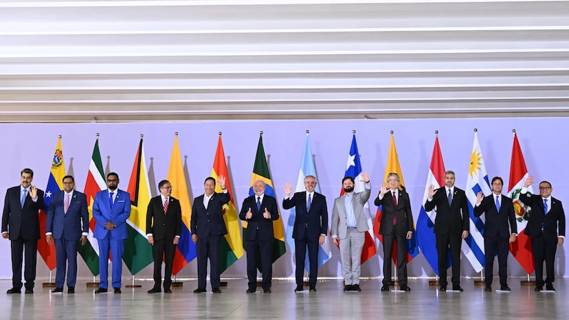 En la foto de familia, el venezolano Maduro está en el extremo izquierdo, al lado de los mandatarios de Surinam y Guyana. En el centro, Lula, Fernández, Arce, Petro y Boric. Para propiciar la confianza y el diálogo franco, cada presidente ha asistido con su canciller y uno o dos asesores.