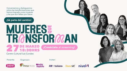 Este jueves, en la Corporación Cultural de Las Condes, en el sector oriente de Santiago de Chile, se realizó el evento Mujeres que Transforman, organizado por PRISA Media Chile y Mujer Impacta, donde destacadas figuras femeninas compartieron sus historias, proyectos y visiones sobre el cambio social en el país sudamericano. La reunión fue conducida por la periodista María Elena Dressel, voz de Radio Concierto, y contó con un panel de influyentes mujeres conformado por: la presidenta de la CPC, Susana Jiménez; la directora y fundadora de Fundación Mujer Mundo, Constanza Lizama; María Paz Tagle, directora y fundadora de Mujer Impacta; Ximena Abogabir, fundadora de Travesía 100; Isidora Uribe, fundadora de la iniciativa en pro de la inclusividad, Encuentra tu Lugar, y Natalia Rebolledo, directora ejecutiva de la Fundación Un alto en el desierto. También, se realizó un especial reconocimiento a Patricia May, creadora de la Escuela del Alma y autora del libro El emerger de una nueva consciencia, quien destaca por su aporte desde las ciencias sociales al desarrollo social en nuestro país. Durante el encuentro, la antropóloga además conversó con la jefa de información de EL PAÍS Chile, Rocío Montes.