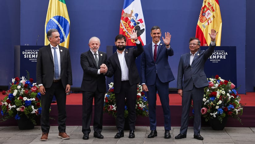 El presidente de Chile, Gabriel Boric, ha defendido este lunes en La Moneda la importancia de que los Gobiernos progresistas se unan y compartan sus conocimientos, en momentos en que la democracia sufre ataques en distintos rincones del mundo, provenientes de diversos sectores. El llamamiento lo ha realizado junto a su homólogo de Brasil, Luiz Inácio Lula da Silva; Uruguay, Yamandú Orsi; Colombia, Gustavo Petro; y España, Pedro Sánchez, en el marco de la cumbre internacional Democracia Siempre. Parte de la agenda definida por los líderes en Santiago es colaborar para que los algoritmos no manipulen la opinión de los usuarios y reducir la desigualdad social, ambiental, económica, “que termina por romper la confianza en las instituciones”. El mandatario chileno ha anunciado que una decena de presidentes se han sumado a la cruzada, entre ellos la mexicana Claudia Sheinbaum, el canadiense Mark Carney, y el inglés Keir Starmer.