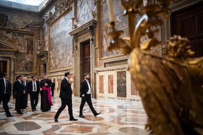 León XIV, en tanto, entregó a Boric el Mensaje para la Paz, que escribió Francisco, la escultura Diálogo entre generaciones y un libro de arte del Palacio Apostólico de Roma.