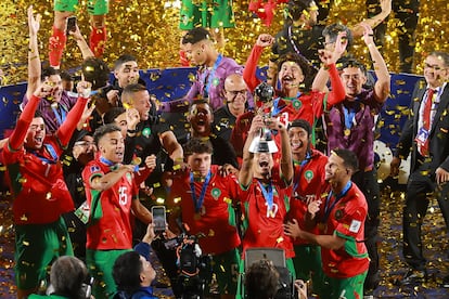 “Este triunfo fue una travesía heroica, que honró dignamente a la patria e hizo brillar al continente africano”, dijo el monarca inmediatamente después de la victoria de 2 a 0 celebrada en la madrugada en todos los rincones del país una vez que el capitán Hosaam Essadak levantara la Copa que le había entregado Infantino, para convertir en héroes a los dos mejores jugadores del equipo, Yassir Zabiri y el veloz Othmane Maamma.