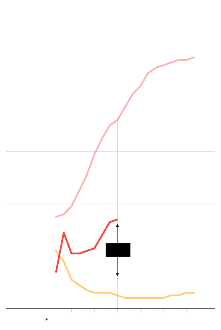 El gráfico representa la tasa de letalidad hasta ahora. El brote de coronavirus está siendo peor que el H1N1 en 2009: entonces hubo 300 muertos asociados a los 77.000 primeros casos (0,4%), pero con las mismas infecciones el coronavirus se asocia a 2.200 muertes (2,8%). Son siete veces más.