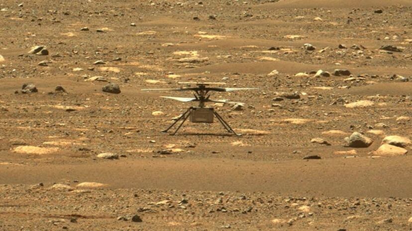 El Perseverance está estacionado a unos cien metros del helipuerto marciano. A esa distancia, el pequeño helicóptero, que no levanta tres palmos del suelo, apenas se distingue. Ha hecho falta utilizar el zoom de la cámara a máximo aumento.