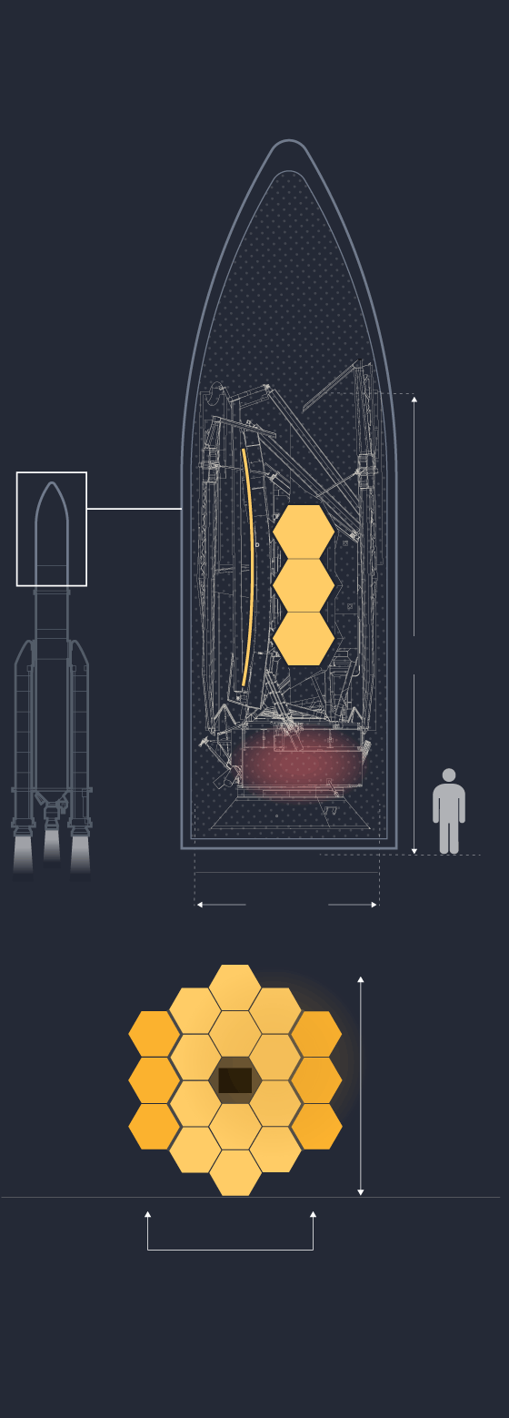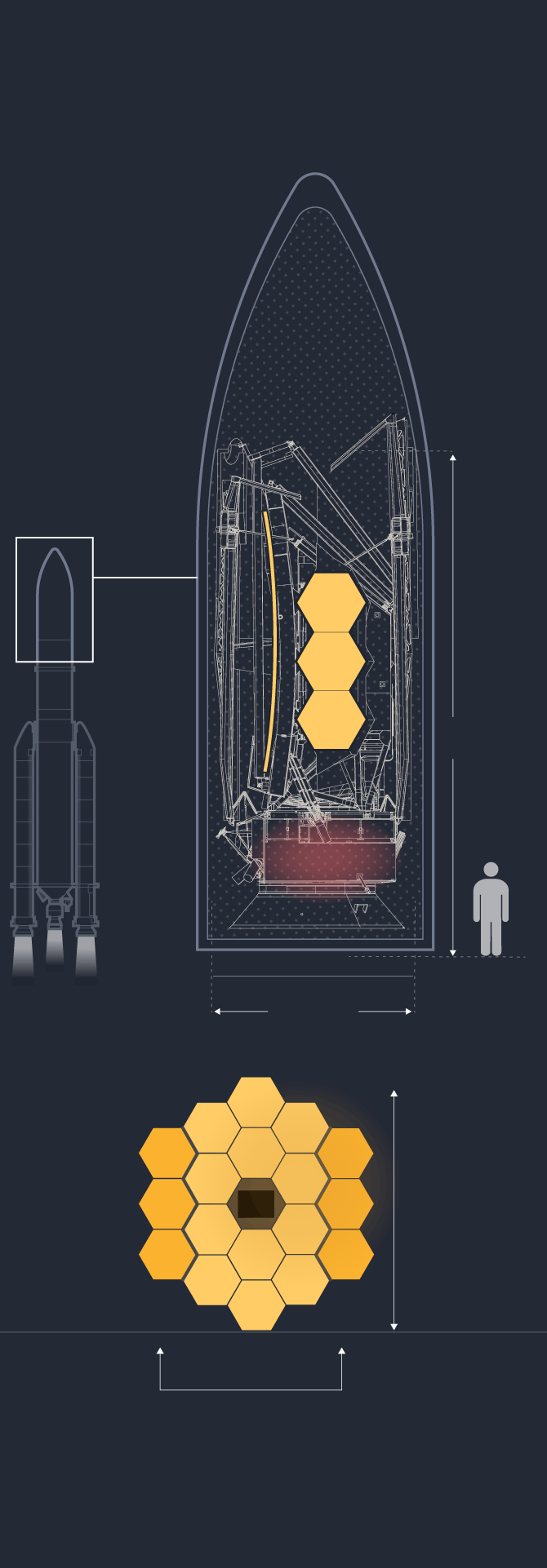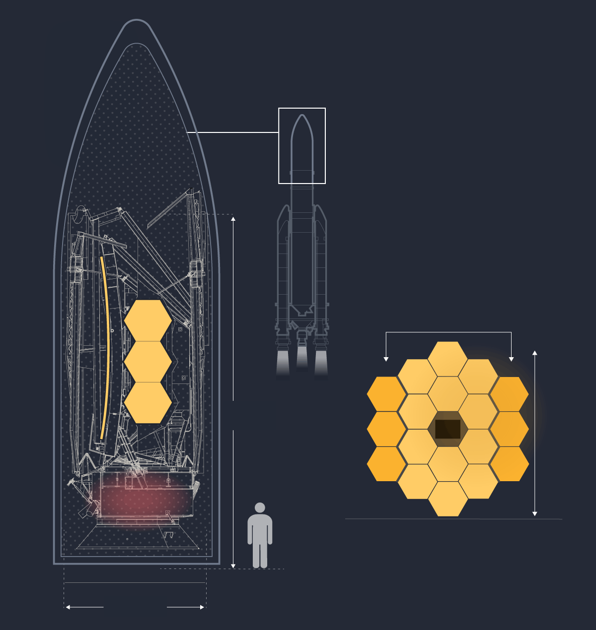En estos momentos el Webb descansa sobre casi 800 toneladas de pólvora e hidrógeno líquido en el interior de un cohete Ariane 5. El espejo es tan grande que ha habido que idear una forma de plegarlo sobre sí mismo para entrar en la cofia superior del artefacto. Tras el despegue desde el puerto espacial europeo en la Guayana Francesa, el Webb viajará un millón y medio de kilómetros hasta el punto de Lagrange 2. En este lugar podrá permanecer alineado con la Tierra a medida que esta orbita el Sol. Hay una desventaja: estará tan lejos que será imposible ir a repararlo como se hizo con el Hubble. La secuencia de despliegue y puesta en funcionamiento de este telescopio es la más compleja de la historia y hay unas 300 maniobras que podrían fallar echando al traste la misión, según la NASA.