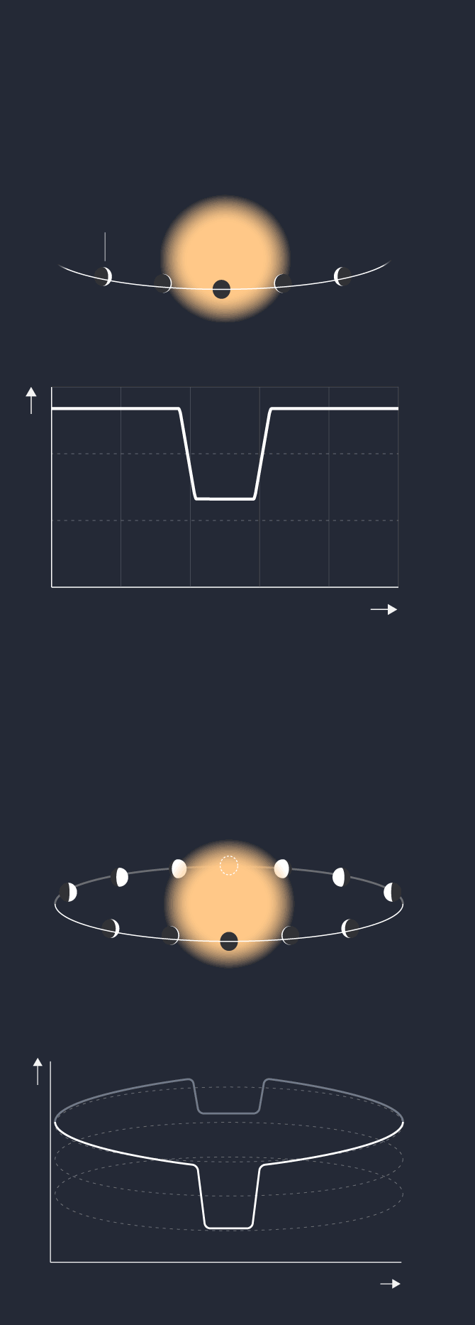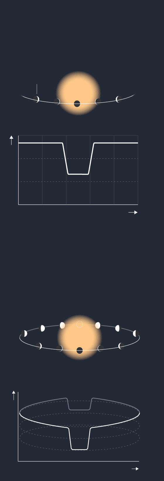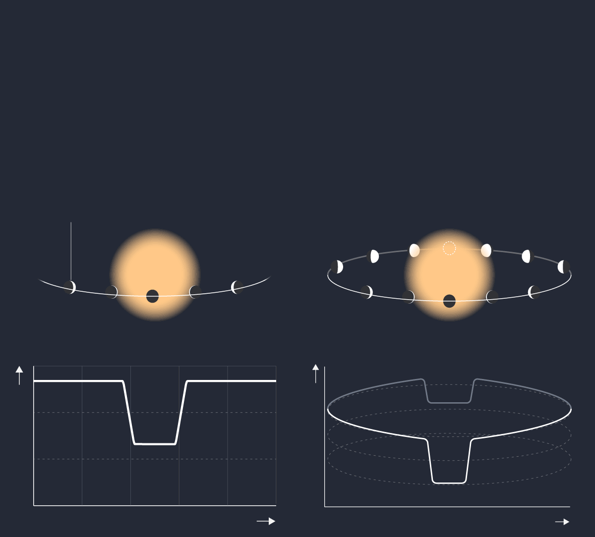 1. Cuando un exoplaneta pasa delante de su estrella se produce un pequeño eclipse que disminuye la luminosidad.