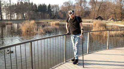 El holandés Gert-Jan Oskam, de 40 años, quedó paralizado tras un accidente en bicicleta y ahora puede subir escaleras con muletas