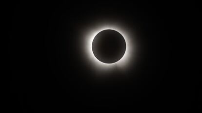 A las 13.51, hora local (siete horas más en la España peninsular), la Luna ha tapado por completo el Sol, trayendo consigo un momento de desconcertante oscuridad que ha durado unos tres minutos. Los suspiros de asombro y los gritos de euforia se han apoderado de parte de los miles de personas reunidas en el campus mientras el Sol se apagaba. Luego, en ese momento indescriptible en que el Sol está tapado por completo y solo se ve un anillo de luz alrededor de la Luna, se ha ido imponiendo el silencio ante lo majestuoso del espectáculo celestial.