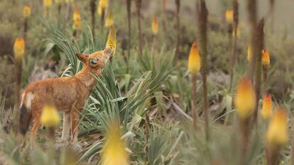 A los lobos etíopes les encanta recorrer los campos de flores de las montañas de Bale, al sur del país africano. Algunos de ellos pueden hacerlo hasta durante hora y media, incitados por las brillantes espigas anaranjadas de una planta típica de esa zona. Atraídos por su dulce néctar, lamen con avidez las flores más maduras, mientras su hocico se impregna del pegajoso polen de color amarillo que tiene sabor a miel. Por primera vez, ese comportamiento tan peculiar para un gran depredador ha sido documentado, gracias a un estudio realizado por un equipo de científicos que lidera Sandra Lai, bióloga de la Universidad de Oxford (Reino Unido).