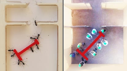 Solo hay dos tipos de animales capaces de transportar un objeto tan grande que solo pueden lograrlo cooperando y yendo a una: los humanos y las hormigas. Y no todas las 15.000 especies de formícidos saben hacer algo así. Apenas el 1% son capaces de trabajar en equipo como para lograr sacar un trozo en forma de T a través de dos estrechas puertas muy juntas. El experimento es propio de la informática y la inteligencia artificial, pero un grupo de entomólogos lo ha usado para comparar las habilidades cognitivas de los insectos y las personas, tanto de forma individual como trabajando en equipo. En igualdad de condiciones, las hormigas nos superan en inteligencia colectiva.