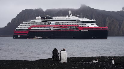 La escena es desconcertante. Tres militares españoles y dos periodistas de EL PAÍS, ataviados con aparatosos trajes de protección impermeables, llegan en zódiac a Caleta Péndulo, una playa con fumarolas procedentes de un volcán activo que sobresale en el océano Antártico y forma la remota isla Decepción. El hostil paraje, a temperaturas bajo cero pero con aguas termales, está lleno de turistas, como si fuera Benidorm. Sus teléfonos móviles graban vídeos verticales y los visitantes adoptan las poses típicas de Instagram y TikTok. Fondeado frente a la costa está el crucero de lujo Roald Amundsen —recién comprado por un consorcio de fondos de inversión de Londres y Nueva York— con unos 500 viajeros que han pagado unos 20.000 euros cada uno. Detrás de ese barco llega otro. Y, después, otro. El turismo masivo, que colapsa pueblos y ciudades de todo el mundo, también ha alcanzado el último continente virgen del planeta.