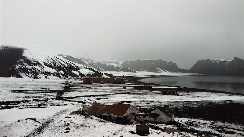 A unos cinco kilómetros al sur de los despojos de la base chilena, el biólogo Antonio Quesada camina por otras ruinas mientras cuenta su historia. En plena Segunda Guerra Mundial, en 1943, el Ejército británico lanzó aquí la Operación Tabarin, una misión secreta para crear bases militares en la Antártida. Los expedicionarios establecieron la llamada Estación B, aprovechando las desvencijadas cabañas de un antiguo poblado ballenero. Tras la erupción de 1967, el barco chileno de Jorge Iturriaga tuvo que rescatar a los británicos, indefensos ante la lluvia de magma. En 1969, tras sucesivas erupciones que provocaron una riada de barro, la base también fue abandonada definitivamente. Los restos de un cementerio sepultado por el lodo ponen los pelos de punta.