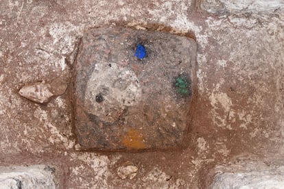 “En el centro de la plataforma tenemos un grupo arquitectónico que tiene otra plataforma alargada hacia el este y un montículo, como una pequeña pirámide de tierra, al oeste”, detalla la investigadora. Esta configuración la conocen entre los arqueólogos como grupo E y sirve “entre otras cosas, para observar el movimiento del sol en el horizonte, cuando te paras en un montículo del oeste, vas a ver cómo va saliendo el sol en el este y en ciertos momentos del año sale justo al centro, en el eje central”, explica Vázquez. Esos momentos son exactamente el 24 de febrero y el 17 de octubre, con un intervalo de 130 días, es decir, la mitad del calendario ritual maya. Al excavarlo, los investigadores encontraron una serie de depósitos rituales que formarían un cosmograma, una representación del Universo en miniatura.