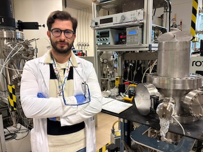 El investigador del ICMS Fernando Núñez, junto al sistema que crea las láminas capaces de recolectar energía de las gotas de la lluvia.CSIC