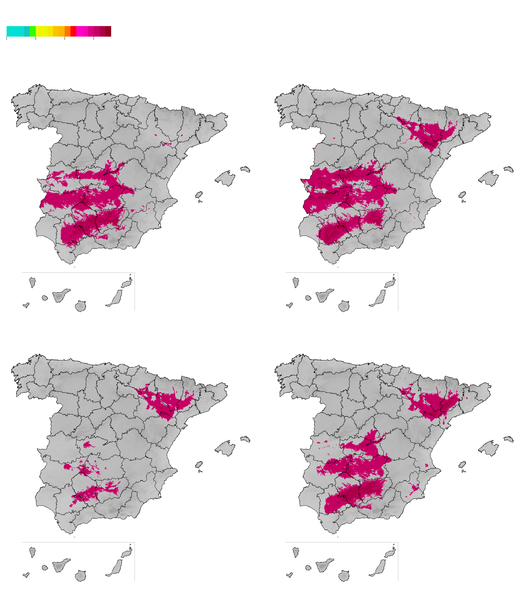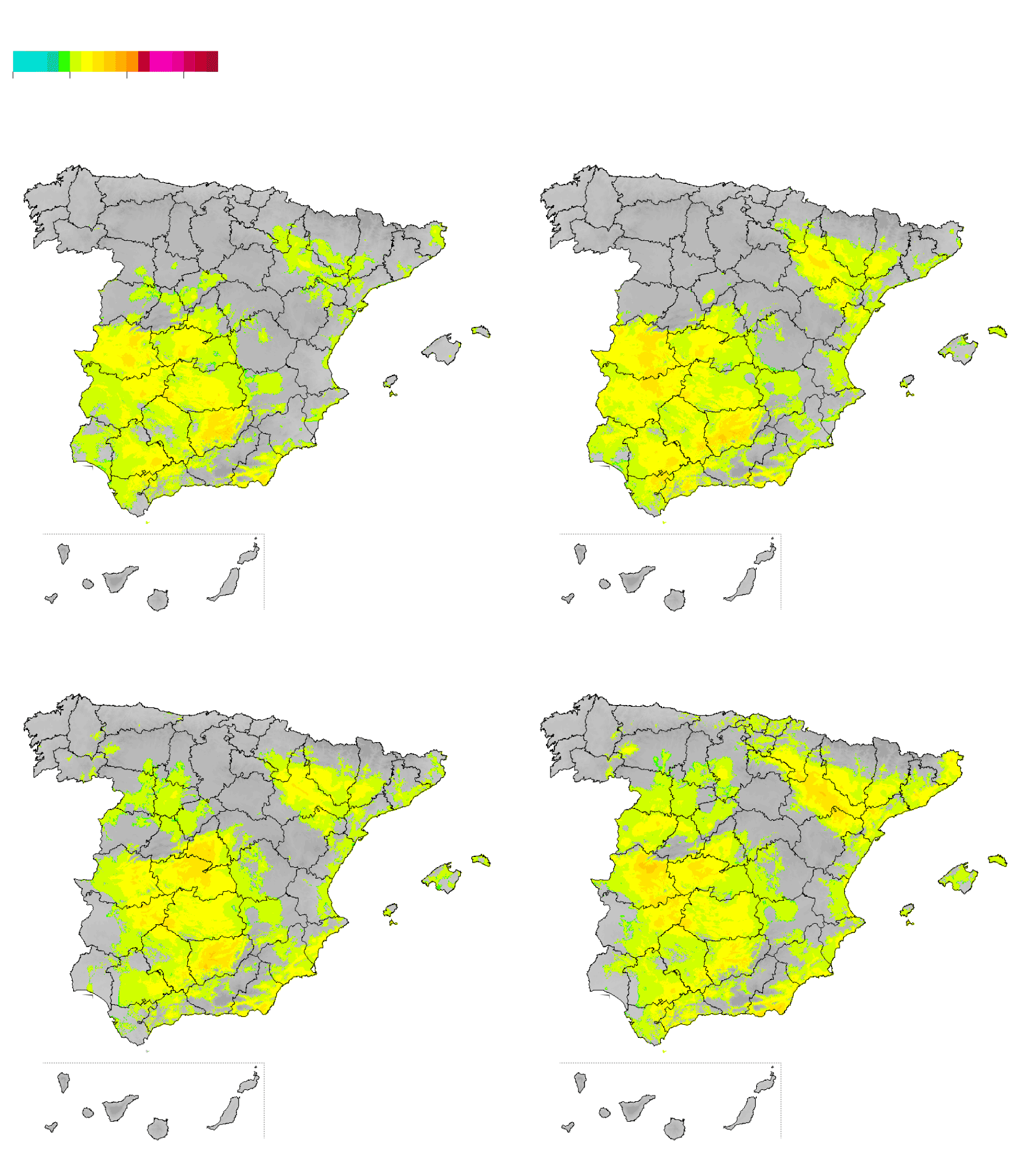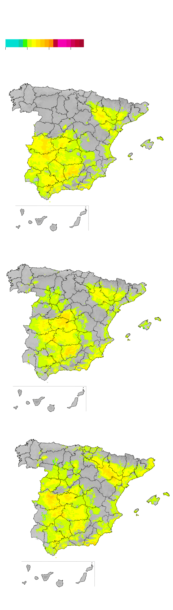 “Las temperaturas de estos días no solo son anómalas para mediados de junio, sino que incluso serían extremas también si se hubiesen medido en plena canícula”, explica la Aemet. Las máximas en la mayor parte de la Península y Baleares superan los 35°, lo que supone entre 7° y 12° por encima de su promedio normal para esta época del año. El rojo oscuro de los 40° se extiende como una mancha de aceite por los valles de los principales ríos del país y el próximo viernes más de la cuarta parte de las capitales de provincia podrán superar dicha cota, como Bilbao, Ciudad Real, Girona, Granada, Huesca, Jaén, Madrid, Murcia, Pamplona, Toledo o Zaragoza. Incluso se esperan 43° en Córdoba y Lleida. Hasta ahora, la temperatura más alta registrada durante la ola han sido los 43,2° del domingo en Almadén (Ciudad Real).