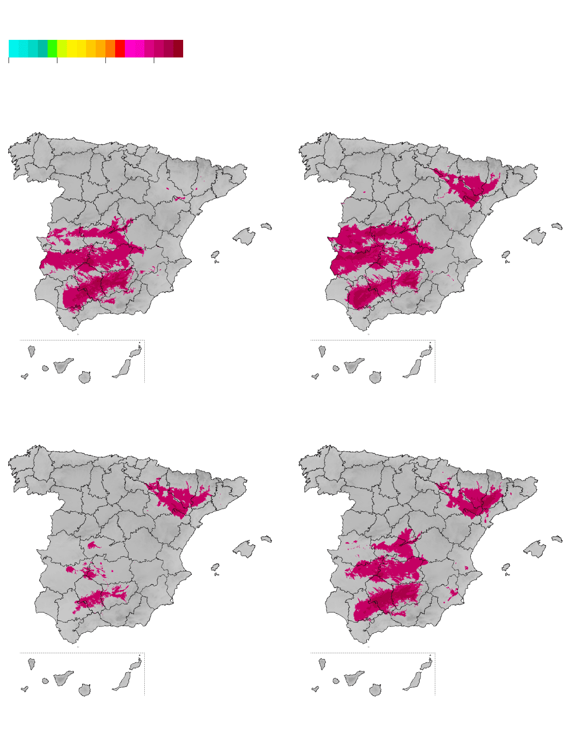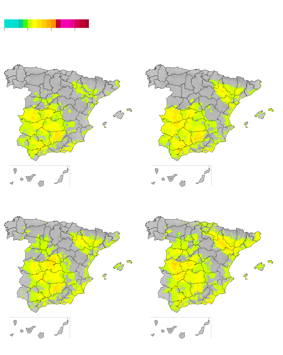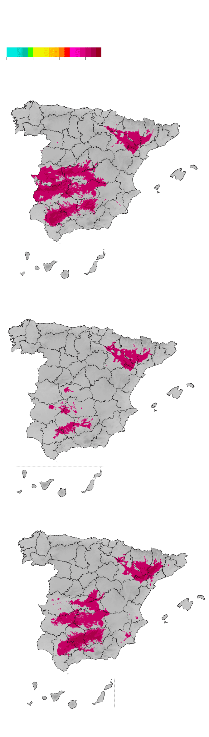 “Las temperaturas de estos días no solo son anómalas para mediados de junio, sino que incluso serían extremas también si se hubiesen medido en plena canícula”, explica la Aemet. Las máximas en la mayor parte de la Península y Baleares superan los 35°, lo que supone entre 7° y 12° por encima de su promedio normal para esta época del año. El rojo oscuro de los 40° se extiende como una mancha de aceite por los valles de los principales ríos del país y el próximo viernes más de la cuarta parte de las capitales de provincia podrán superar dicha cota, como Bilbao, Ciudad Real, Girona, Granada, Huesca, Jaén, Madrid, Murcia, Pamplona, Toledo o Zaragoza. Incluso se esperan 43° en Córdoba y Lleida. Hasta ahora, la temperatura más alta registrada durante la ola han sido los 43,2° del domingo en Almadén (Ciudad Real).