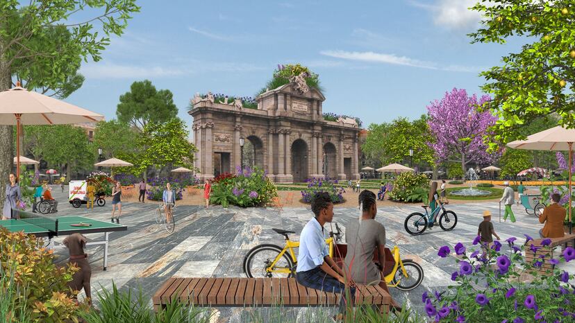 Algunas ciudades están aprovechando ese impulso para hacer realidad esas utopías. El máximo ejemplo es París que, tras peatonalizar una autopista a orillas del Sena, está construyendo centenares de kilómetros de carriles bici, va a eliminar 70.000 plazas de aparcamiento en la calle y proyecta llenar de árboles los Campos Elíseos. Hay ejemplos de urbes que están intentando no perder ese impulso transformador: Barcelona, Milán, Bogotá, Valencia... Otras lo hicieron hace años: en Berlín, la icónica Puerta de Brandeburgo es peatonal desde 2002. Mientras, en Madrid los cambios van a cuentagotas. “Me encantaría sentarme con el alcalde de Madrid para charlar de esta idea y hacerla realidad”, señala el artista. Aunque por ahora su sueño es una utopía y las fotos del lugar seguirán llenas de humo.