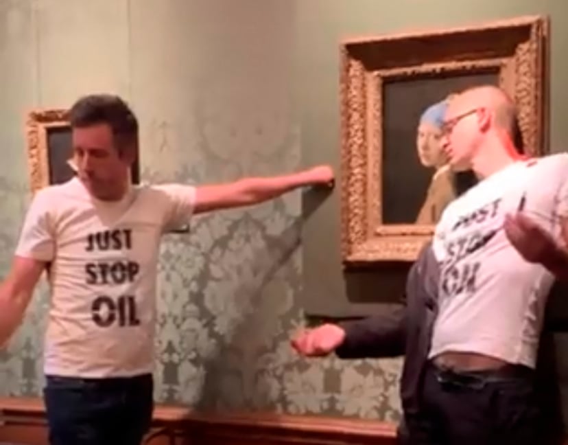 La policía holandesa ha detenido este jueves a tres activistas climáticos después de que atacasen el cuadro La joven de la perla (1665), del pintor del Siglo de Oro Johannes Vermeer. La obra, protegida por un cristal, no ha resultado dañada, según la galería Mauritshuis, de la ciudad de La Haya, donde está colgada. En una filmación difundida en Twitter, puede verse a dos de los asaltantes acercándose al lienzo. Uno de ellos lleva lo que parece pegamento en la mano y apoya su cabeza a la altura del turbante que lleva la modelo plasmada por el artista. El otro asaltante abre entonces una lata y vierte sobre su compañero el contenido: un producto rojo. Este se acerca de nuevo al cuadro mientras su acompañante pregunta a gritos al público que cómo se sienten al ver algo bello siendo aparentemente destruido. Los visitantes le piden que se calle y le responden diciendo que debería sentirse avergonzado.