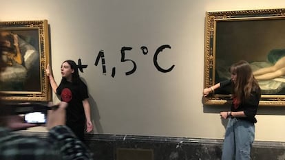 El activismo climático está subiendo de intensidad a la vez que aumenta la temperatura del planeta. A las protestas de organizaciones ecologistas clásicas como Greenpeace o Ecologistas en Acción ―que llevan décadas cortando carreteras o encaramándose a macrogranjas o plataformas petrolíferas—, se han sumado en los últimos meses las acciones radicales de Futuro Vegetal, un colectivo de desobediencia civil creado hace tan solo un año cuyos miembros han logrado gran repercusión al pegarse a las majas de Goya en el Museo del Prado —una acción similar a la que ya habían realizado activistas internacionales de Just Stop Oil por toda Europa—, cortar parte de la M-30 de Madrid o una etapa de la Vuelta a España y, el pasado lunes, intentar amarrarse a la tribuna del Congreso. Son acciones disruptivas que llaman la atención porque subvierten el orden de las cosas y generan incomodidad, aunque no dañan el patrimonio.