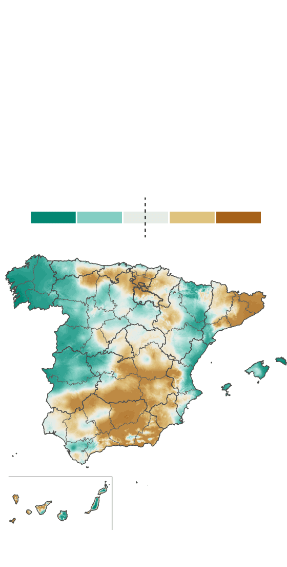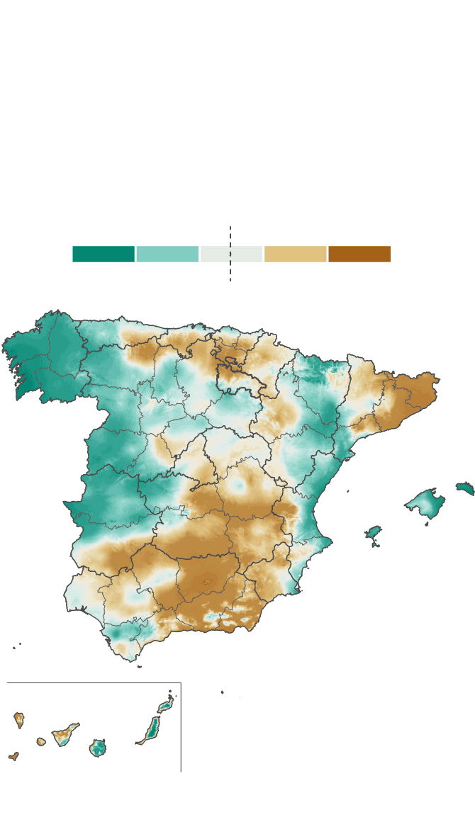 Además de a las reservas de los embalses, el déficit de lluvias acumuladas también afecta a la humedad del suelo, es decir, la sequía agrícola. Y esto de nuevo golpea al sector de la agricultura e, indirectamente, a la ganadería, porque reduce y encare el alimento para los animales. COAG afirma que la mayor parte de las cosechas de trigo y cebada en la mitad sur de la Península ya se dan por perdidas y peligran gravemente las de la mitad norte si la lluvia no termina de llegar. Porque estos cultivos son de secano: no reciben agua de los embalses, sino que dependen de las precipitaciones. En España, las producciones medias de cereales se sitúan en unos 20 millones de toneladas. El año pasado, con las lluvias de marzo y abril, la cosecha fue de solo 18 millones. En este año, sin casi precipitaciones, se teme una caída histórica.
