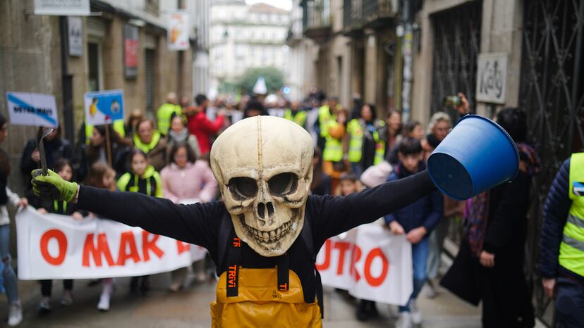 Peces de colores tragando bolitas blancas; caballitos de mar; esqueletos; redes; los coladores, rastrillos, escobas y cedazos con los que los voluntarios llevan dos semanas largas cosechando las mareas diarias de pellets; o una sirena vomitando el mismo granulado plástico (dibujada por el artista Leandro Lamas) fueron algunas de las imágenes que recorrieron las calles de Santiago desde el punto de convocatoria, este domingo al mediodía en la Alameda de la capital gallega. Al acto se sumaron los líderes de los principales partidos (salvo el PP), candidatos a las próximas Elecciones gallegas, desde Ana Pontón, portavoz de la primera fuerza de la oposición, el BNG; hasta Marta Lois (Sumar), acompañada de la vicepresidenta segunda del Gobierno, Yolanda Díaz; Irene Montero, secretaria política de Podemos; y el también candidato José Ramón Gómez Besteiro (PSdeG) después de participar con Pedro Sánchez en la clausura de la Convención Nacional del PSOE.