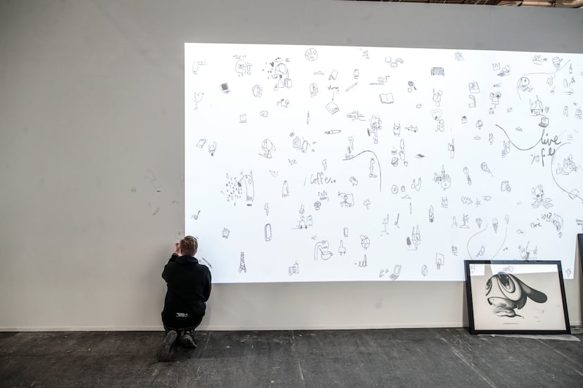 Edgar Plans saca un puñado de lápices del bolsillo trasero del pantalón. Mira el lienzo en blanco y, casi sin pensar, comienza a dibujar. Una tableta, un fantasma, una canasta de baloncesto… “Es como la mente de alguien. Quiere decir que cualquier cosa puede ser noticia”, explica. El lienzo es una de las paredes del espacio de EL PAÍS en ARCO, y Plans, el artista invitado por el periódico este año. My Daily News es su propuesta, un tributo al periodismo que, tan solo un día antes de la apertura de la feria, el artista asturiano se afanaba en terminar.