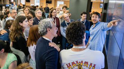 Pedro Zuazua, director de Comunicación de EL PAÍS, les dio la bienvenida -“un periódico es una mirada compartida con miles de personas”- y les adelantó lo que podrían ver en las siguientes tres horas . Los visitantes quedaron asombrados cuando dieron las ocho en punto, se hizo el silencio en la redacción y todos se agolparon delante de las múltiples pantallas, pendientes de la publicación de los primeros sondeos de resultados.